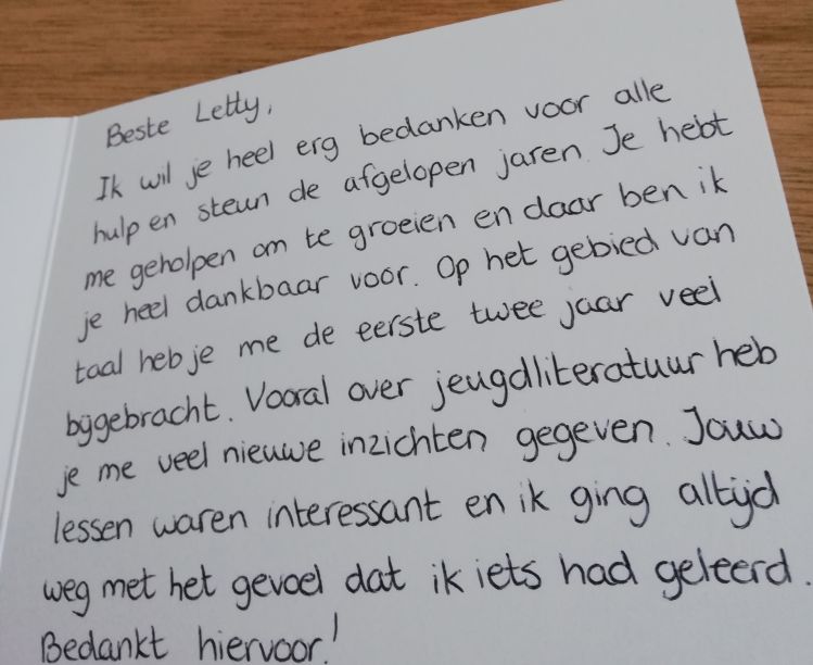 Wij hebben Letty leren kennen als een zeer kundig en betrouwbaar iemand. Heb je problemen op school of loop je tegen iets aan op het gebied van de Nederlandse taal qua spelling, lezen schrijven of grammatica. Dan ben je bij Letty op het juiste adres. Met veel geduld en de juiste aandacht begeleidt Letty haar leerlingen. Als geen ander weet zij iemand op de juiste manier te begeleiden en te motiveren. De resultaten zijn er naar. Ellen Boelhouwers – Fijnaart